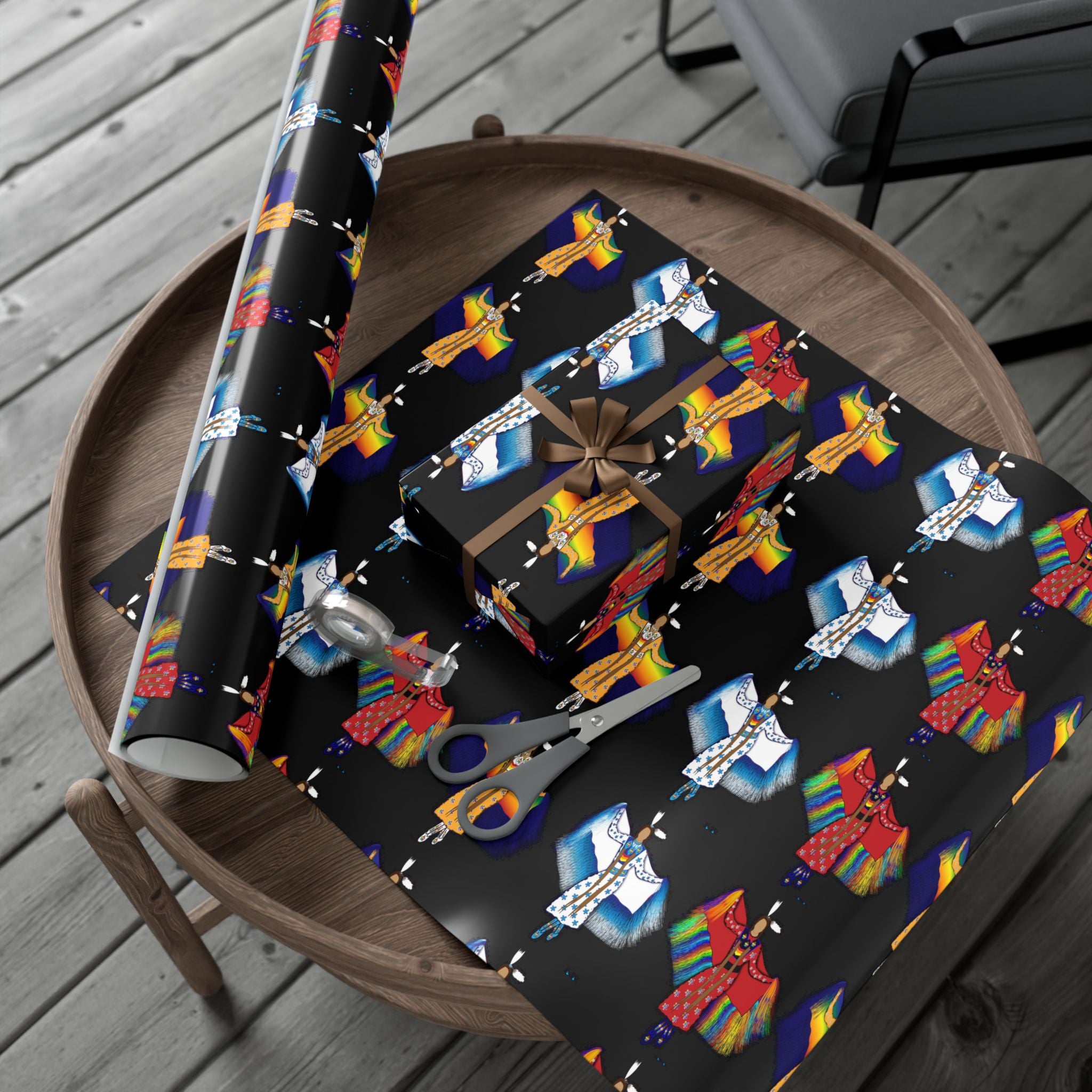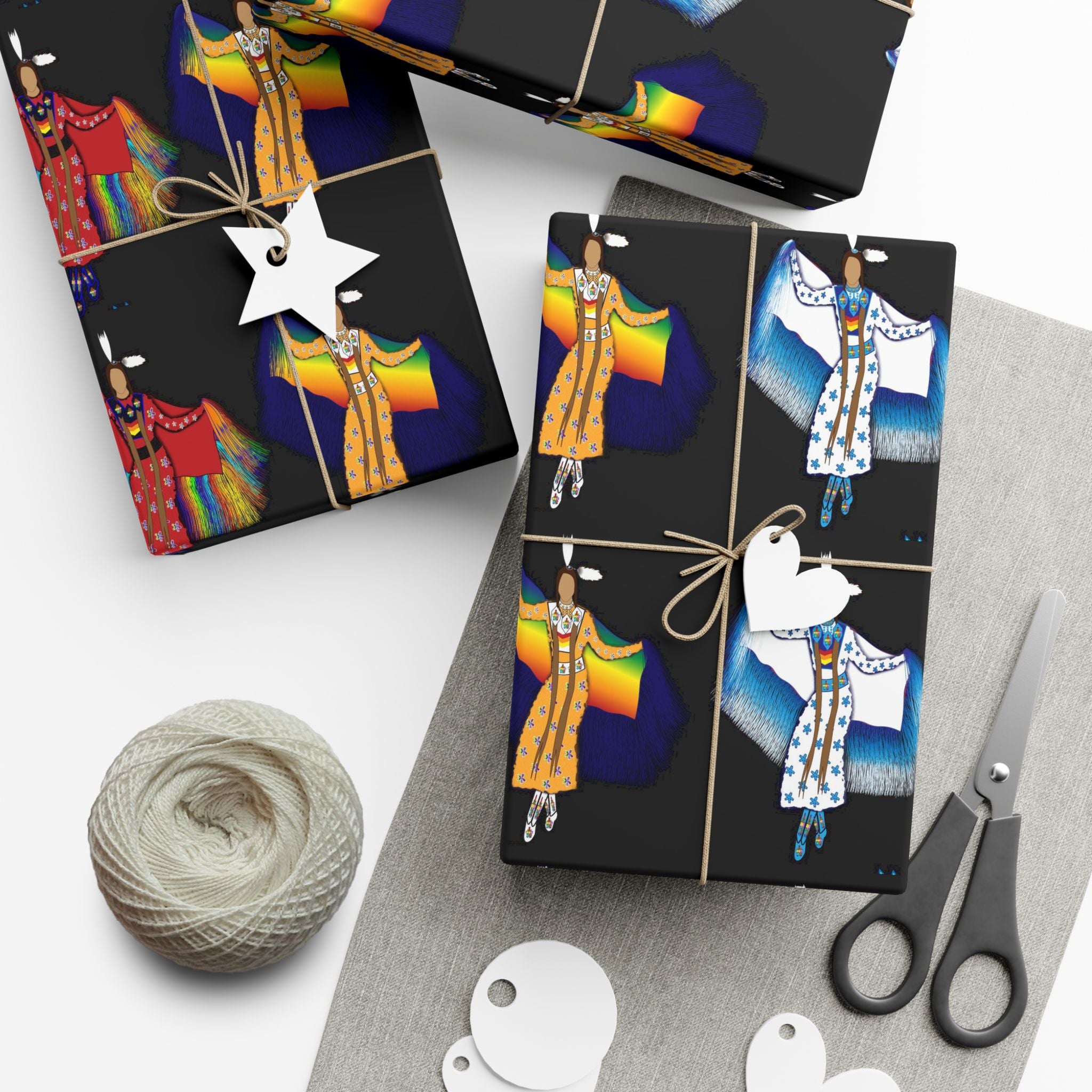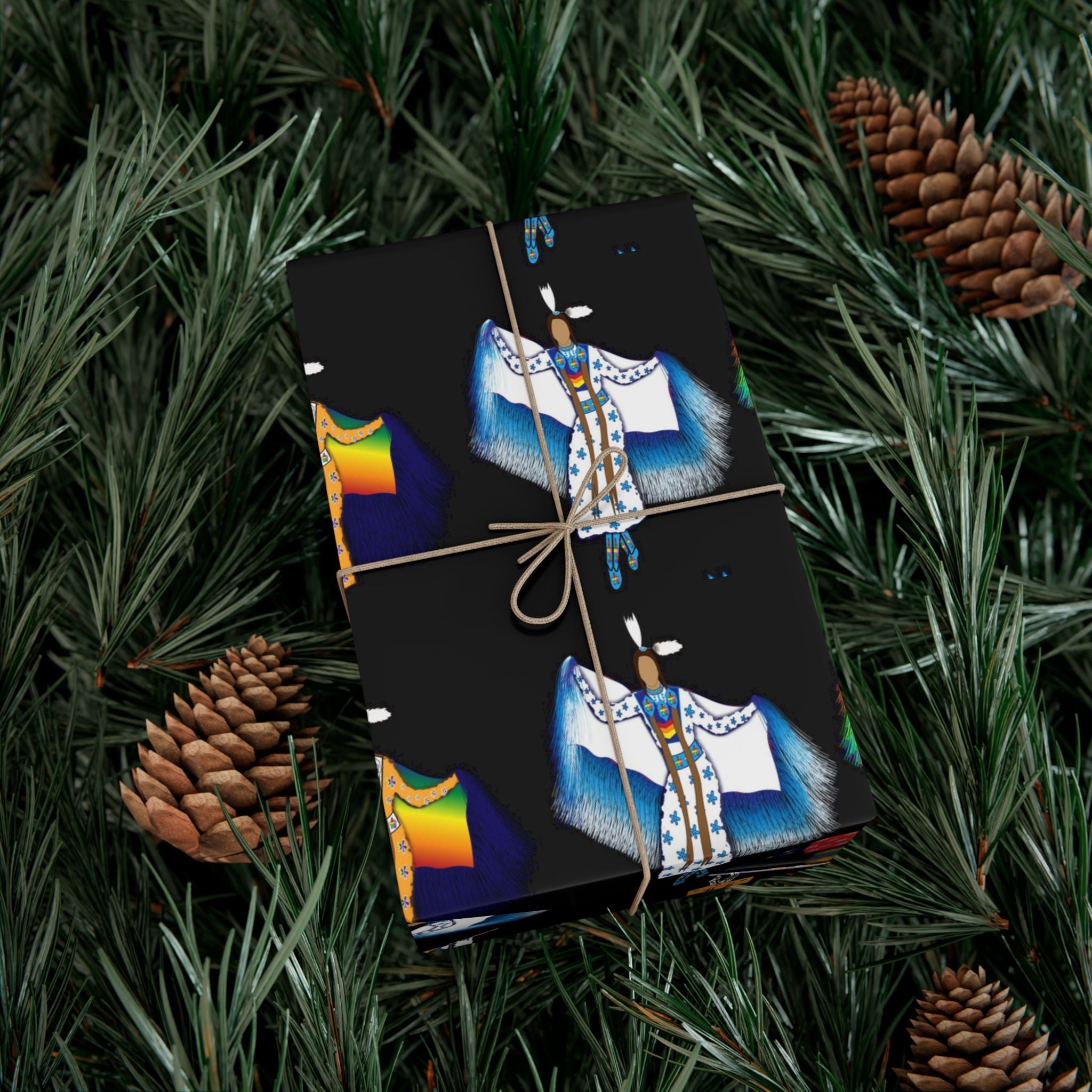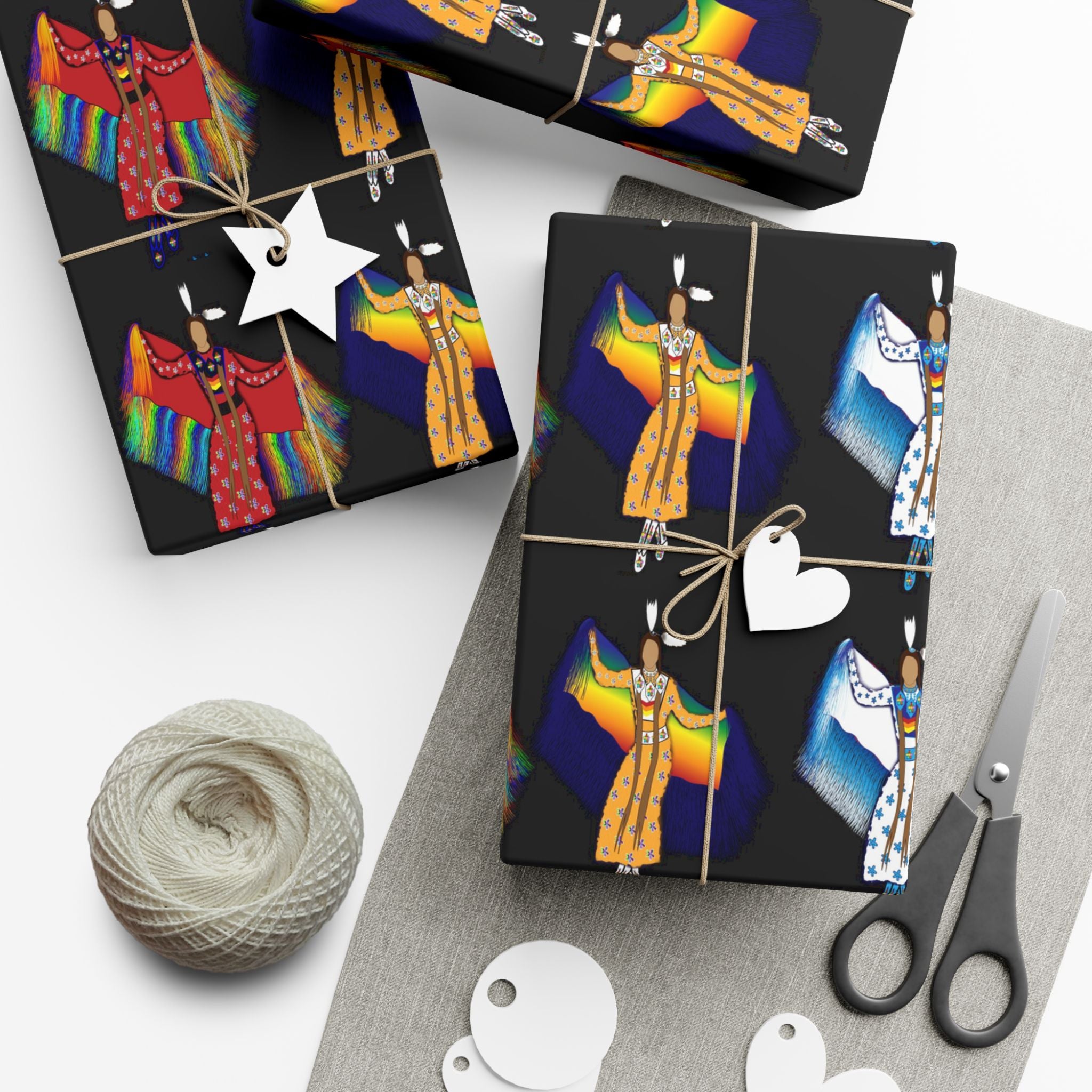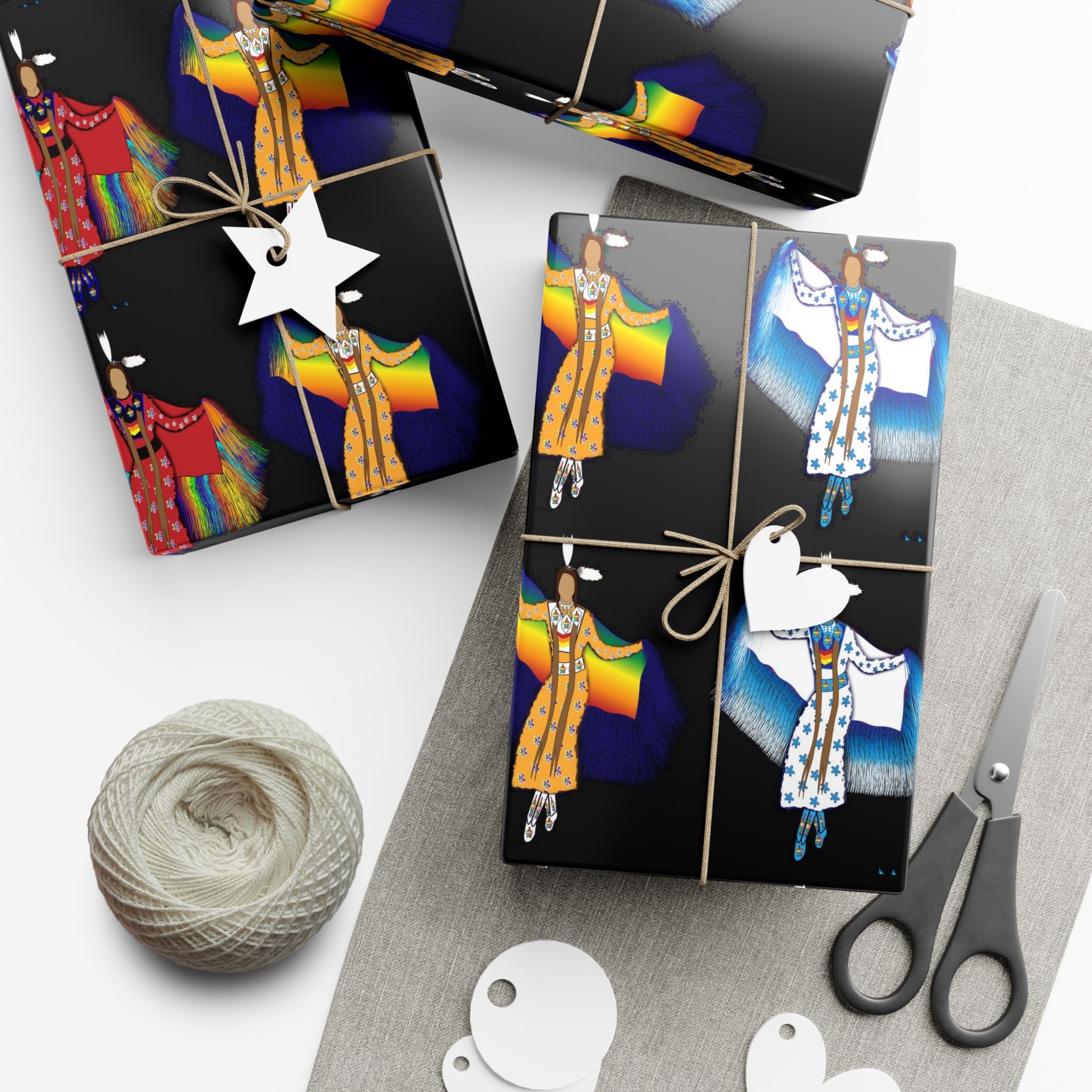 Fancy Dancers drawn and designed by Angela Gillette, owner of White Corn Wear. Make any gift bring an even wider smile to the receiver with this personalized gift wrap paper. Perfect display of Native American Powwow Culture.