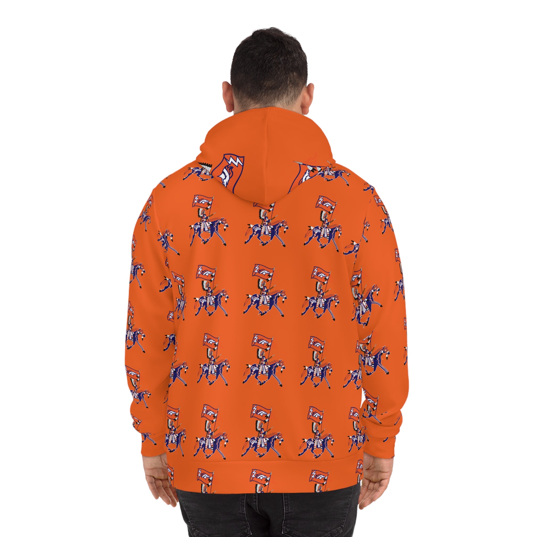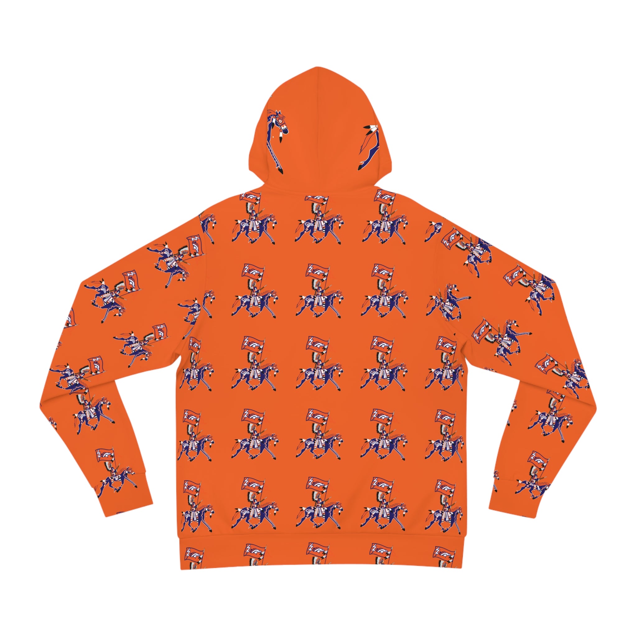 This hoodie brings stadium energy and wide-open plains into everyday wear. A hand-drawn bronco, rendered with Native-inspired linework by Angela Gillette, charges across the fabric—bold and kinetic. The medium-heavy knit feels substantial without being stiff, draping easily over layers while the roomy kangaroo pocket keeps hands warm after long nights under lights. Subtle details like a drawstring hood with metal grommets and double-stitched seams mean it wears well through seasons and road trips. Worn by fans who like their gear to look handmade and rooted in a place, it carries both grit and artistry—ready for tailgates, chilly practices, or slow drives home from the game.